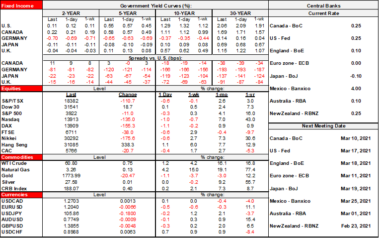 - Equities are losing ground with the S&P down by about ½%, the TSX down by ¾% and European markets off by up to 1.1% in Germany.