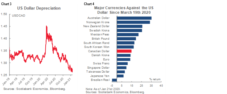 Now consider charts 3–4. My issue is with the portrayal of what has happened to the currency and the implied points about the drivers. Chart 3 makes it clear that the currency is only a handful of pennies (about 3%) firmer than it was before the pandemic struck. While it depreciated massively into the March–April pandemic shock, it has since only recouped all of that and a few cents more. Chart 4 shows that this movement since March has been uneven against other crosses such that on a full trade-weighted basis the C$ has not appreciated by as much as it has against the USD. I don’t think the Governor should be worried about a currency that is just a few cents firmer than it was before the pandemic with the kind of growth outlook they and we are forecasting, but that’s roughly the right time frame to utilize. Long lagging movements in the currency along a 1+ year timeline are generally viewed by most as required in order to materially impact forecasts for things like inflation or trade and when judged in that time frame the currency has barely moved. For inflation pass-through purposes, tracking begins to be worthwhile when it’s a sustained 10% trade-weighted appreciation, and even those pass-through estimates have fallen over time and are more likely to be dominated by other drivers of inflation going forward. To even begin to get toward that point in a pre-pandemic versus now sense would require the currency to punch below 1.20 USDCAD (1.264 now).