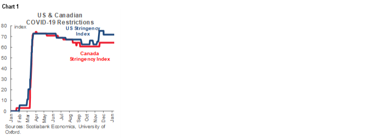Consensus -38k, Scotia -60k, highly scattered range from around -125k to +31k. Notwithstanding a 95% confidence interval of +/-58k (90% at +/- 46k), I lean pretty strongly toward a negative. Key is the timing of restrictions that hit just after the prior month’s reference week that includes the 15th of each month. January’s job report is also likely to face downside risk on further restrictions and because Ontario’s extended school closures will go right through the Labour Force Reference week and probably have a particularly negative impact upon working moms as evidenced the first time around.