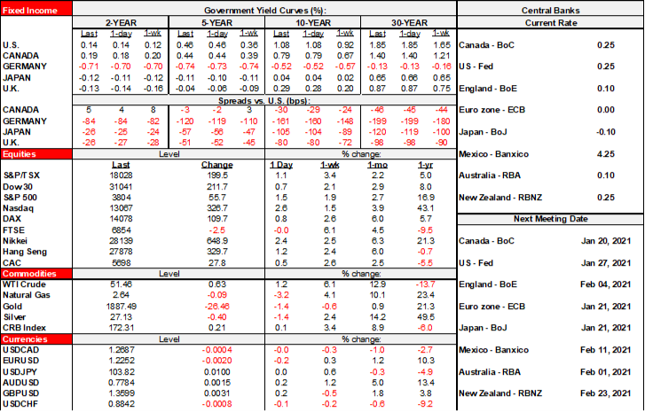 The Fed’s #2 speaks on the US economy and monetary policy in a conversation at the Council on Foreign Relations. Key may be whether he reinforces recent taper talk from some FOMC speakers (e.g. Kaplan, Bostic) but I suspect he’ll lean more toward Bullard’s answer that indicated it’s too early to address this. A lot has happened since Powell spoke in mid-December and so his remarks on the outlook and risks may be meaningful. Several positive developments have included passing the Brexit deal, getting the US stimulus deal passed, the ‘blue wave’ and market moves like a further rise in inflation expectations. Confidence in vaccines, however, has been dented until we get the results of trials against the London and South African mutations into a February/March timeline.