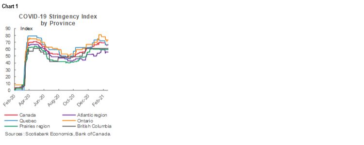 - The BoC’s new high frequency provincial stringency indices that measure restrictions confirm this easing into the February reference week (chart 1).