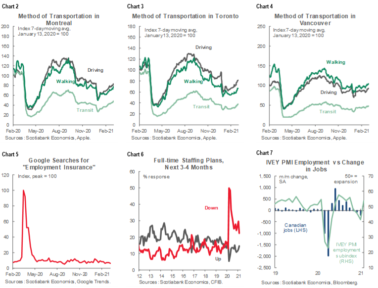 - Mobility readings picked up by more than the improvement in the stringency indices in the biggest cities of Toronto, Montreal and Vancouver (charts 2–4). The measures had generally gotten back toward last Fall’s levels before second wave clampdowns.