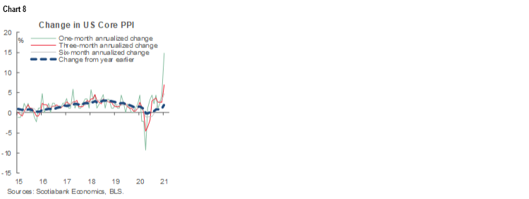 Core producer prices are expected to accelerate by the fastest pace since early 2019 and not just due to base effects as the prior month had registered a 1.2% m/m jump for the fastest rise in many years. Chart 8 shows the sharp recent acceleration in producer prices excluding food and energy which generally confirms guidance in surveys like the ISM reports that indicate rising price pressures across supply chains.