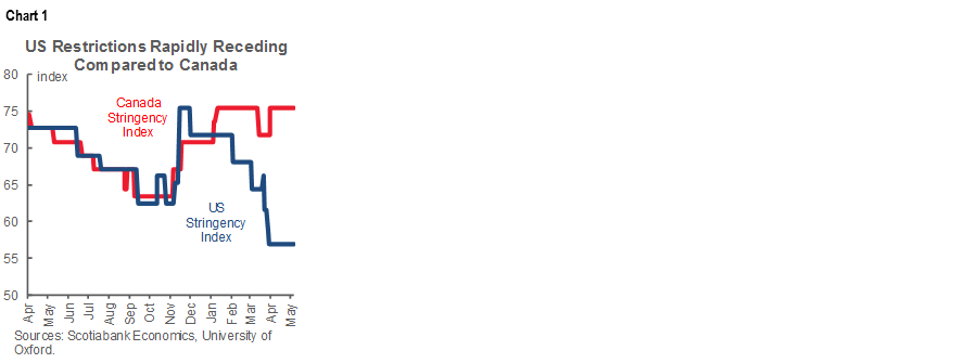 There is mild risk-on sentiment so far. US payrolls are all that matter to global markets and Canada’s jobs report will be followed in the local market. Chart 1 shows the movements in COVID-19 restrictions in the two countries that is basically the rationale behind why an acceleration of US job growth and a loss of Canadian jobs is likely to occur. Other overnight releases were relatively trivial and mostly a round-up of European industrial and export figures that are irrelevant on a day with payrolls. The one exception was a remark by an ECB Governing Council Member (Kazaks) that they could reduce the pace of PEPP EGB buying at the June meeting. Lagarde is speaking now but so far is not broaching the topic.