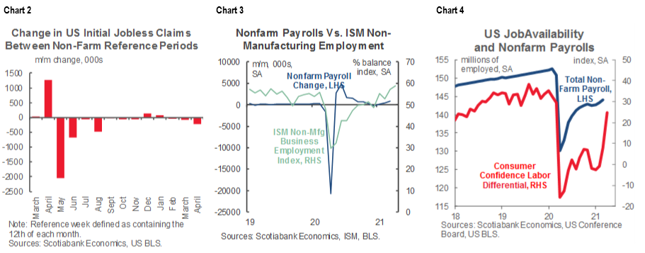My rationale is this: There should be a material improvement in the pace of hiring over the last month based on the suite of advance indicators as restrictions eased across the US economy. I'm more confident in direction of the pace of change than in the magnitude. Restrictions measured by the stringency index are still material but at their least restrictive since last about mid-March last year. Mobility readings have picked up. Initial claims fell by more between reference periods this time than any other period since last August when payrolls went up by about 1.6 million (chart 2). ADP climbed at its fastest pace since last August. ISM-services-employment climbed to its highest since September 2018 (yes 2018). See chart 3. US consumer confidence signals on job availability soared (chart 4). Basically, everything showed an acceleration of hiring in April.