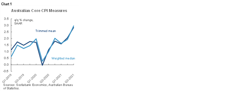 The credibility of the RBA’s yield target and its overall dovish policy stance is being increasingly challenged. The RBA’s 3-year government bond yield target of 0.1% was put under more strain overnight on the heels of an upside surprise to Australian inflation readings. The 3-year yield soared by 16bps to 92bps. Both trimmed mean CPI and weighted median CPI increased by 0.7% q/q non-annualized (consensus 0.5%) which pushed both measures higher to 2.1% y/y and into the RBA’s 2–3% inflation target range for headline that itself eased back to 3% y/y (3.1% consensus, 3.8% prior). The annualized and seasonally adjusted q/q rates of both central tendency inflation gauges are at the upper end of the 2–3% target range (chart 1) which leans against any temptation to dismiss it as driven by year-over-year base effects. New Zealand’s curve also sharply bear flattened with the two-year yield up 14bps.