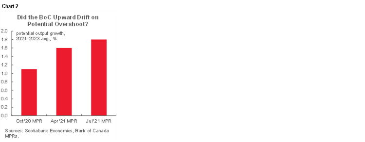 I won’t repeat the whole underlying rationale, but one key issue is that there is a lot of uncertainty around what they may do with potential GDP growth within the output gap framework. Recall that the BoC has been steadily revising it higher from a low of 1.1% y/y on average over 2021–23 in the October 2020 MPR to 1.6% in the April 2021 MPR to 1.8% in the July 2021 MPR (chart 2). They have backed off their worst estimates for damage to the economy’s productive potential compared to when they were assuming more labour market scarring and more damage to investment confidence closer to the depths of the pandemic. The evidence on material scarring is now weak at best, given the jobs recovery, while investment is ripping with equipment spending up 25% q/q SAAR in Q2 and another double digit gain being tracked in Q3. I doubt they back pedal on that upward trend in estimates of potential GDP growth over a three year time frame, or at least not by enough to shut spare capacity sooner than 2022H2. Growth has disappointed over 2021Q1–3 and some of the drivers of potential GDP have not worsened.