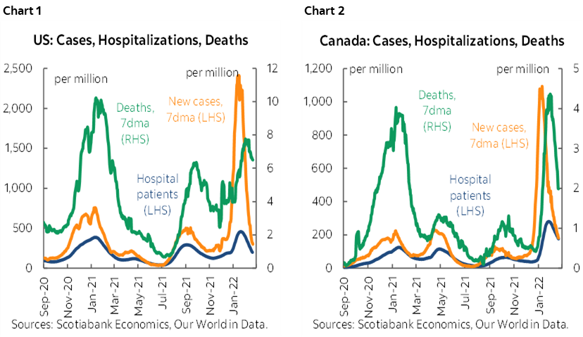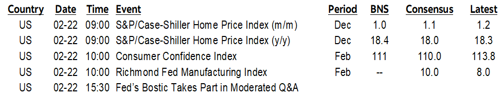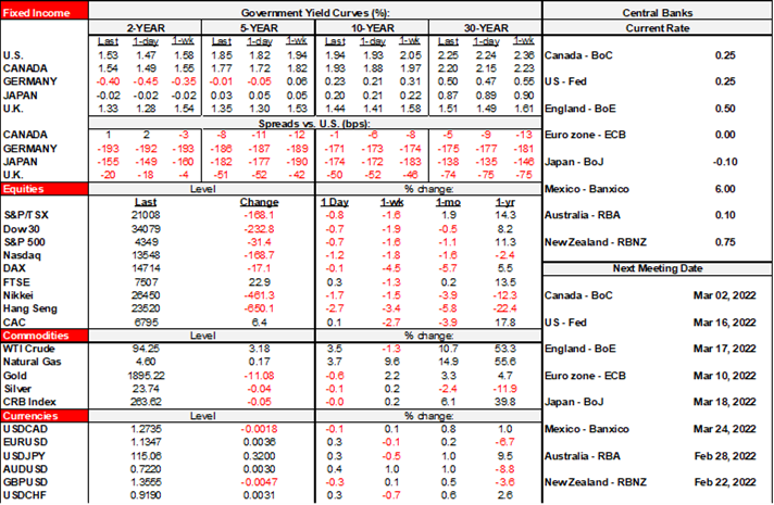 So far, the effects upon markets are relatively mild outside of oil’s inflationary impulses. Oil prices are up by about US$2–3 per barrel. US equity futures are down by up to ½% (Nasdaq) but the moves across the S&P500 and TSX are minor so far after yesterday’s -¾% declines by the S&P500 and the TSX. European cash markets range from down ¼% in Germany to up ¼% in London. US Treasuries are bear flattening with 2s about 6–7bps cheaper and the longer end is only slightly cheaper. Flattening moves are also driving gilts and bunds. The USD is slightly weaker this morning but generally little changed since Friday’s close despite the developments in Ukraine.