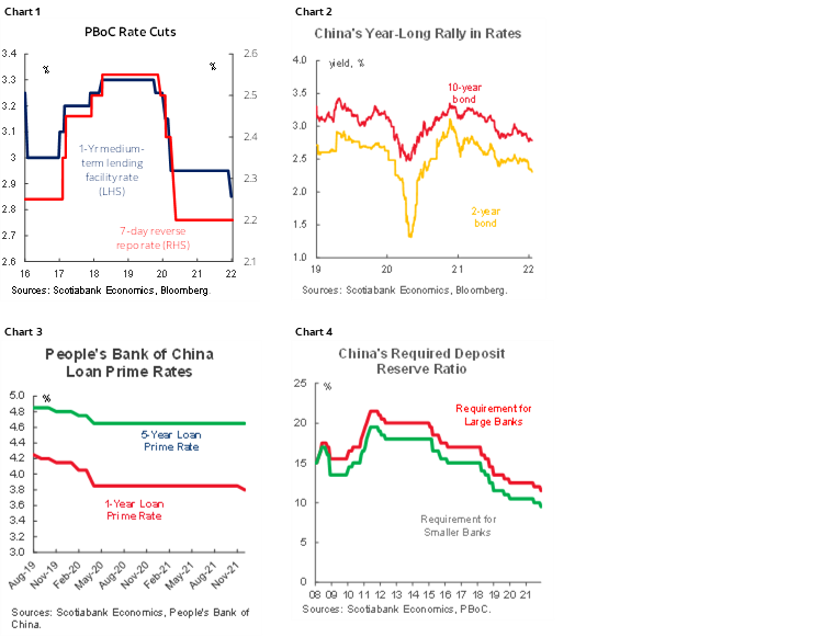 The PBOC teased with a 10bps cut to the 1-yr Medium-term Lending Facility Rate (now 2.85%) and a 10bps reduction to the seven-day reverse repurchase rate (now 2.1%) as shown in chart 1. The moves have been long in the making as China’s rates curve has been rallying throughout the past year (chart 2) and reflect lagging policy adjustments that have been guided to expect for some time now. These moves leave the door open to reductions in at least the 5-year Loan Prime Rate and perhaps also the 1-year LPR on Wednesday evening eastern time (chart 3), to further subsequent rate reductions as a monetary policy easing cycle continues and to additional cuts in required reserve ratios after the reduction in mid-December (chart 4). The 10bps cut to the MLF exceeds the 5bps cut to the 1-year LPR that banks drove in December and so we could see them add another cut this week and carry-through with a first reduction in the 5-year LPR. If the PBOC is intent upon addressing mounting downside risks to China’s economy in the context of no inflationary pressures, then -10bps won’t do anything material to address the fact that it still has among the world’s highest real policy rates. Chinese monetary policy remains overly tight and the bigger risk to stability stems from an overly tight policy stance. After having dragged its feet through much of 2021 while criticizing easy policy elsewhere, the shoe is arguably on the other foot now.