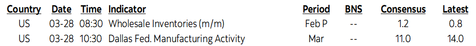 - Canada refreshes Q1 GDP tracking with January’s final estimate and February’s preliminary estimates on Thursday.