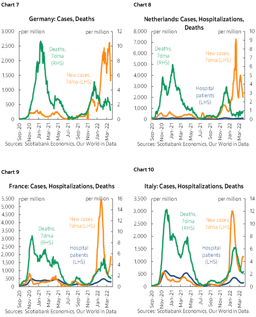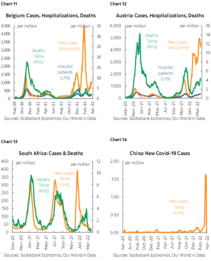 A fresh trading week is starting off with a continued bond market sell-off. Sovereign curves are mostly bear flattening with 2-year yields up ~7bps in Canada and 4bps in the US which puts Canada about 10bps above the US 2s yield. Friday’s BoC speech (here) and an anticipated heavy-spending Budget are driving this move. The gilts curve is slightly flattening as 10s are rallying by more than 2s; 2s were selling off aggressively earlier this morning before BoE Governor Bailey’s remarks (see below). EGBs are slightly bear flattening. The USD is strengthening particularly against the yen after the BoJ’s moves (see below). Oil is off by about $6/barrel likely on the effects on oil demand of China’s lockdowns (see below). Stocks are mixed with US futures up a touch, TSX futures a touch lower and following oil prices and with European cash markets up by between ¾% (London) and around 2%. Shares fell in Tokyo and Shenzhen, were up by 1.3% in HK and were flat in Shanghai and Seoul.