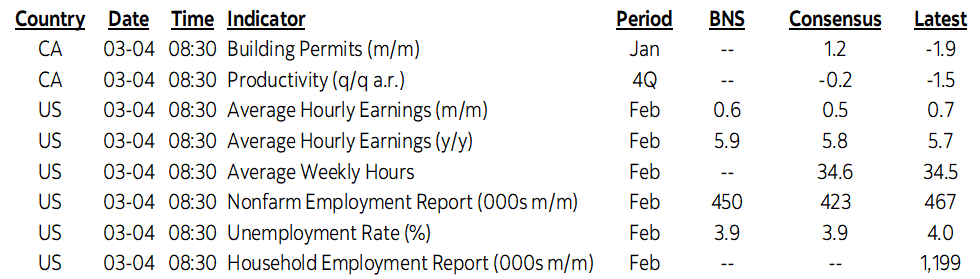 As for nonfarm payrolls (8:30amET), I gave a preview in yesterday morning’s note so will keep it short here. Consensus is at 423k and I’m at 450k so no difference this time. Wages are arguably more important and are expected to inch further toward the 6% y/y mark. The unemployment rate is expected to slip a touch to under 4% and is getting closer to the pre-pandemic 3 ½% level. The participation rate may climb higher again from 62.2% and remains about 1.2ppts below pre-pandemic levels, but willingness to supply labour this cycle may be more damaged than in the past.