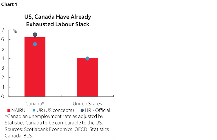 In both the US and Canada (that updates jobs next week) the issue is estimating maximum employment. Chart 1 shows one approach by comparing official unemployment rates to estimates of the unemployment rates beneath which wage pressures may intensify. Both countries are in that zone already.