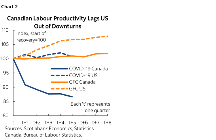 Overnight releases were inconsequential to markets. The won and Thai baht both shook off hotter than expected inflation readings. German exports sank 2.8% m/m in January with imports down 4.2% m/m and they too were overshadowed by other developments. Ditto for stronger than expected French industrial output (1.6% m/m, consensus 0.5%) and the Eurozone retail sales tally that beat as a stale add-up of already known country figures. Otherwise, we’ll get Canadian labour productivity for Q4 (8:30amET) which has been terribly uninspiring as the Achilles heel of the Canadian economy (chart 2), plus the Canada Ivey PMI for February (10amET) that mashes every public and private sector purchasing manager into one reading that mixes private sector developments with fiscal policy drivers.