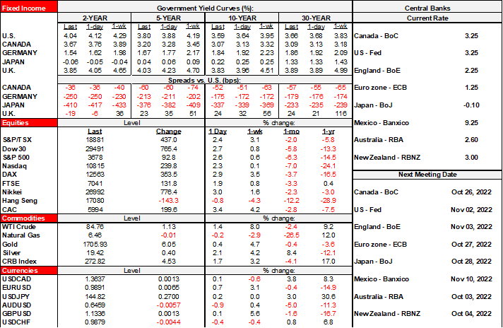 Sovereign bonds are rallying everywhere with the freshest catalyst being the RBA’s smaller than expected rate hike. I go over reasons why I think that narrative is misplaced (again….) below, but for now the US 2-year yield is 7bps lower on the day so far (though 5bps higher than the lows) and 10s are 6bps lower. Gilts continue to rally hard with 2s down 26bps and 10s 12bps. EGBs are rallying by 5–10bps across maturities but double digit declines in Italian yields. Most currencies are rallying against the USD except for the A$ (RBA), yen, NZ$ (on the market assumption the RBNZ will follow the RBA tonight) and CAD on the often false market narrative that somehow the dynamics surrounding the RBA and the BoC are similar to one another. Stocks are up with US futures rallying by an impressive ~1½–2% and TSX futures performing similarly. European cash markets are up by between 2% to 3½%. Oil is up another 1%+ ahead of tomorrow’s OPEC+ decision on whether to cut output and by how much.