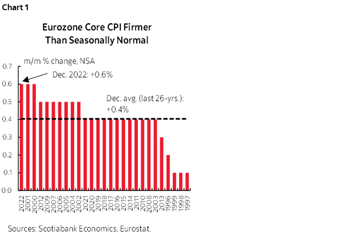 Headline inflation eased to -0.3% m/m NSA and 9.2% y/y (10.1% prior). That was mainly driven by weaker energy prices including market drivers and subsidy changes and may reverse higher in the next print given, for instance, higher caps rolled out into the new year. For now, the -0.3% m/m NSA reading is abnormally weak and there has only been one other negative December reading since the Euro Area figures began and that was in 2014, but again, it’s an energy-driven phenomenon.