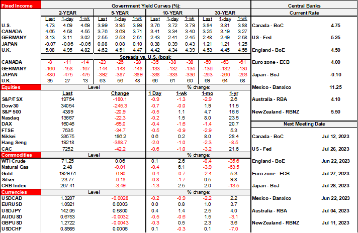 Welcome to the 1st Day of summer in the northern hemisphere. Sovereign bonds are kicking it off under cloudy skies with gilts being the worst performers following another core CPI shocker as markets inch further toward 50bps BoE hike risk versus a dead boring consensus that is devoid of any risk-takers in the boring herd. Market pricing for the BoE is shown in chart 1. Equities are mixed with N.A. and European cash markets generally little changed. The dollar is little changed.