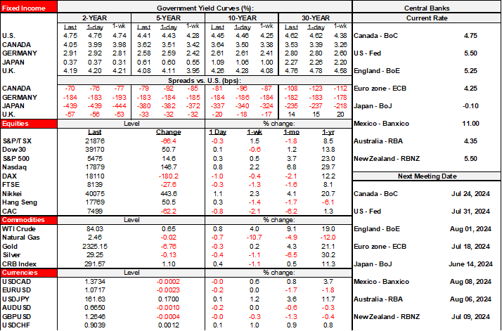 The macro calendar only has a few things to consider. Stocks are mildly lower this morning, the USD is broadly stronger except versus CAD and sovereign bonds are little changed following yesterday’s EGB sell off after Sunday’s first round of the French elections. French 10s are about 7bps higher since Friday which captures the election effect and closing in on the June 11th high in the aftermath of the EU parliamentary elections. This is the last day for strategic withdrawals by candidates in constituencies to back more centrist prospects and weaker National Rally’s chances of emerging victorious in the second round this coming Sunday.
