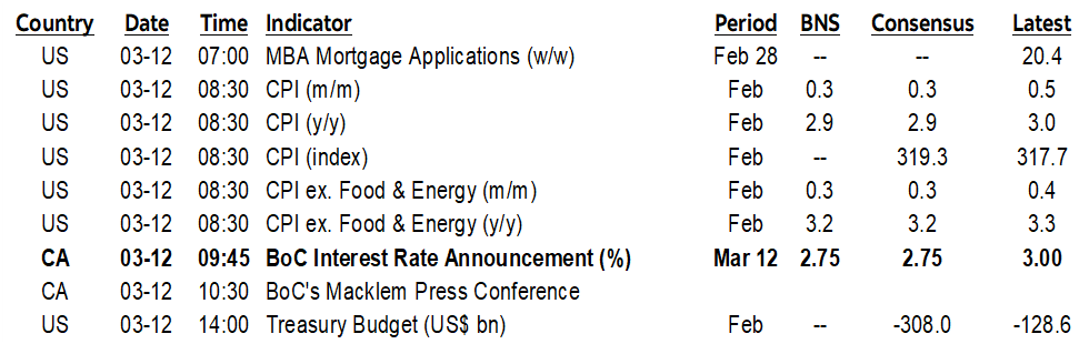 On the bias, I expect Macklem to be very careful in keeping with his prior multiple speeches dating back to September on how the BoC could deal with a trade war. He won’t pre-judge potential tariff moves not least of which given how extremely unglued and volatile Trump can be and given the small actions to date. He will repeat the line about how they can help the economy adjust in a trade war—versus the tariff tiffs to date—but that there is a limit given the damage that could be done to the supply side. He also has some help from a weaker currency and fiscal policy measures, both actual to date and potential future measures.