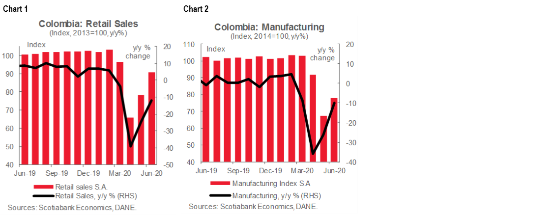 June’s indicators surprised us positively, affirming that the worst of the lockdown’s effects on the economy were in April and that the economic recovery is gaining momentum. July’s data should improve further, although probably at a more moderate recovery pace. In the coming months, the country’s main cities, such as Bogotá and Medellin, are kicking off new pilot plans on commercial flights and restaurants that could continue leading the recovery. Additionally, Barranquilla lifted some mobility restriction and shopping areas are getting better dynamics. In terms of monetary policy, yesterday’s positive data surprise supports BanRep’s gradual approach in adjustments to the monetary policy rate. We think BanRep will cut the monetary policy rate by -25 bps to 2.0% at the August 31 meeting.
