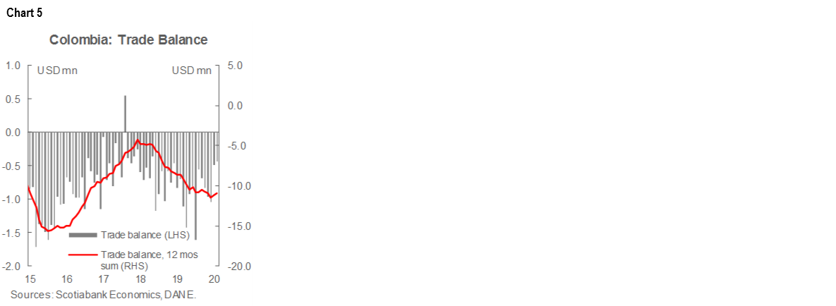A generalized weakening in domestic demand reflected in import data should prevent further deterioration in Colombia’s external accounts. The trade deficit came in at USD 443.5 mn in June, -37.4% y/y, which took the YTD deficit to USD 4.02 bn (chart 5), showing that the external balance is reacting to automatic stabilizers since imports shrank more than in the previous month. All of these should help maintain the current account deficit at around 4.1% of GDP or less in 2020.