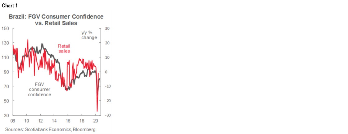 On Monday August 24, the FGV released consumer confidence numbers for August, providing even more evidence that Brazilian consumer sentiment is recovering quickly from the COVID-19 shock. After bottoming at 58.2 in April, consumer confidence has recovered to 80.2 (chart 1), which represents about 2/3 off from its bottom. The most recent print compares with an average of 88 in 2018 and 2019.