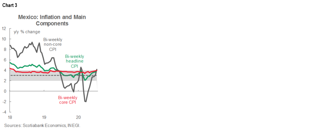 According to figures released by INEGI on Monday, August 24, headline inflation came in at 0.24 2w/2w in the first fortnight of August, surpassing by far the consensus of 0.16% 2w/2w, and the -0.08% printed a year ago. Core inflation came in 0.18% 2w/2w, exceeding both the 0.15% 2w/2w consensus and the 0.11% 2w/2w recorded a year ago, driven by the rebound in merchandise prices of 0.26% 2w/2w (versus - 0.16% previously 2w/2w) and services from 0.02% 2w/2w to 0.09% 2w/2w. Non-core inflation accelerated to 0.43% 2w/2w (versus 0.66% 2w/2w a year ago), owing to an increase in food prices from 0.16% 2w/2w to 0.75% 2w/2w and in government tariffs from 0.15% 2w/2w to 0.60% 2w/2w, offsetting the setback in energy prices from 0.47% 2w/2w to -0.01% 2w/2w (versus -0.23% 2w/2w a year ago).