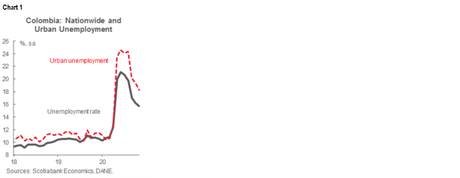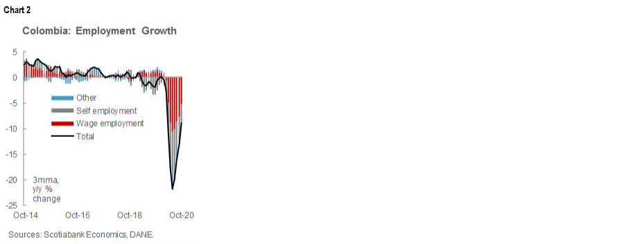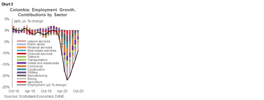 On Monday, November 30, DANE reported that in October, nationwide unemployment came in at 14.7% (October 2019 was 9.8%), while urban unemployment (i.e., across 13 cities) came in at 16.8% (October 2019 was 10.4%). The seasonally-adjusted series showed that the national unemployment rate improved to 15.7% in October versus 16.2% in September 2020, while the urban unemployment rate came down from 19.3% in September to 18.2% in October—the best figures we’ve seen during the pandemic (chart 1). DANE’s Director, Juan Daniel Oviedo, noted that October’s labour-market data clarified some of the structural losses that Colombia’s economy has experienced this year and pointed to some key areas on which public policy could focus to advance the economic recovery.