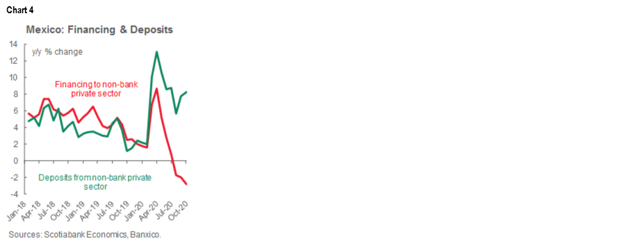 - Commercial bank financing for the private sector declined further in both nominal and real terms. In real terms, it pulled back from a -1.9% y/y contraction in September to a deeper -2.8% y/y decline in October, versus a 2.5% y/y gain in October 2019 (chart 4). Direct financing slowed further, in real terms, from -2.0% y/y in September to -2.8% y/y in October, versus a rise of 2.5% y/y in October 2019. Within direct financing, business lending deepened its contraction from -0.1% y/y in September to -1.3% y/y in October, while consumer financing also continued to fall, this time from -10.8% y/y to -11% y/y. Growth in mortgage lending also moderated in real terms, from 5.1% y/y in September to 4.9% y/y in October;