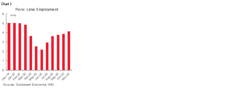 The total number of jobs to November, at 4.14 mn, was a sharp improvement from 2.2 mn during the lockdown (the period ending in June), and an increase in 270,000 jobs from October (chart 3). November jobs were even rather surprisingly close to the 5 mn jobs in Lima pre-COVID-19 (January). Note, however, that jobs gained do not seem to be of the same quality as those lost, and household income level are not rising quite as much.