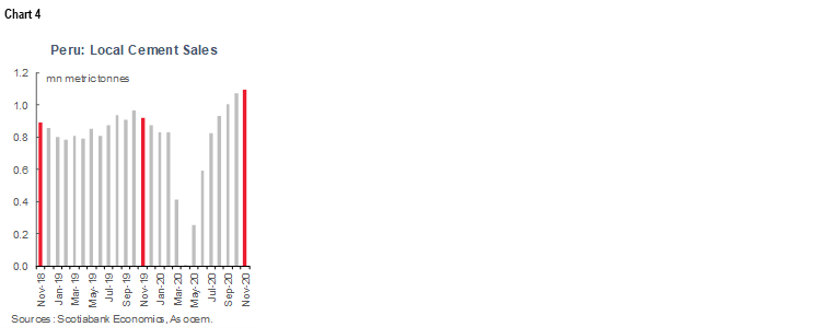 Cement sales soared 18.6% y/y in November, according to reliable data from the Cement Producers Association, Asocem, released on December 15 (chart 4). While Asocem figures are not official, government data tend to mirror them closely. Therefore, we can expect November construction GDP to show very strong growth. Considering that public investment rose 28% y/y in November, construction GDP growth could border 20% y/y. Construction already led in GDP growth in October, when it rose 8.8% y/y. Public investment is adding to a booming real estate sector.