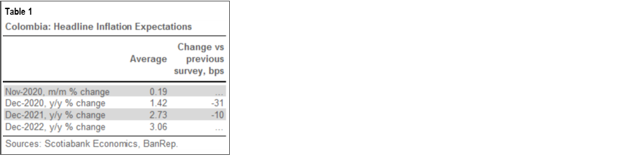 - According to December’s BanRep survey of macroeconomic expectations, analysts’ consensus expects inflation at 1.42% y/y for December 2020, -31 bps lower than last month (table 1). Inflation expectations (IE), for longer tenors did not change much. The 1Y tenor stood at 2.73% y/y, slightly below last month’s survey (2.8% y/y), and the 2Y was at 3.0% y/y (chart 1). Despite the recent downward surprises on October and November inflation, analysts see that as a reflection of temporary developments that should be reversed in the monetary policy horizon. We expect the CPI inflation to close at 1.42% y/y as well, while in 2021, the close would be around 2.8% y/y.