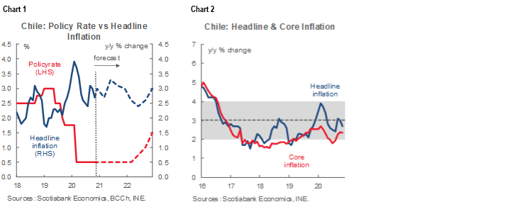 - Chile. The BCCh Board will deliver its next monetary-policy decision on Monday, December 7, where our team in Santiago, the consensus of analysts, and market pricing anticipate another hold at 0.5% (chart 1). However, we do expect a more dovish tone in the Board’s forward guidance, given that we project the recent spike in inflation to be transitory (chart 2), and a possible revisiting of the 0.5% technical minimum. The December Monetary Policy Report follows on Wednesday, December 9, where we anticipate seeing the BCCh upgrade its GDP growth forecasts to reflect the impulse from the imminent second round of pension-fund withdrawals. The minutes of the December 7 rate decision are due to be published on Wednesday, December 23. Our Chile economists project the BCCh to stay on hold until Q2-2022, but markets have been pricing a first hike in late-2021.
