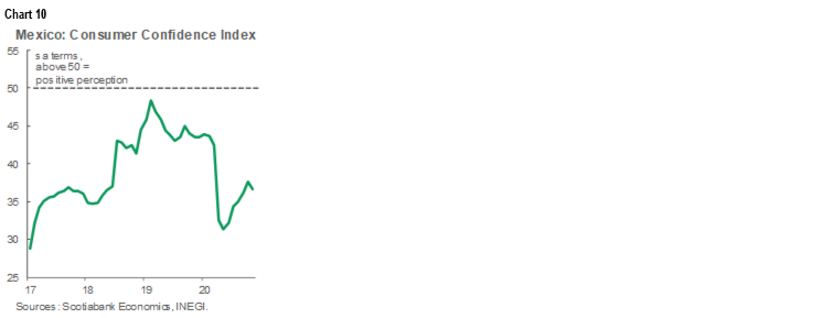 The results of the National Survey on Consumer Confidence (ENCO) for November, released on Friday, December 4, showed that sentiment weakened in seasonally-adjusted terms for the first time since June (chart 10), when the gradual re-opening of various activities started. The November reading, combined with rising COVID-19 new case numbers and ongoing uncertainty around the pandemic, likely foreshadowed a slowing in consumer spending in the coming months. Digging into the details: