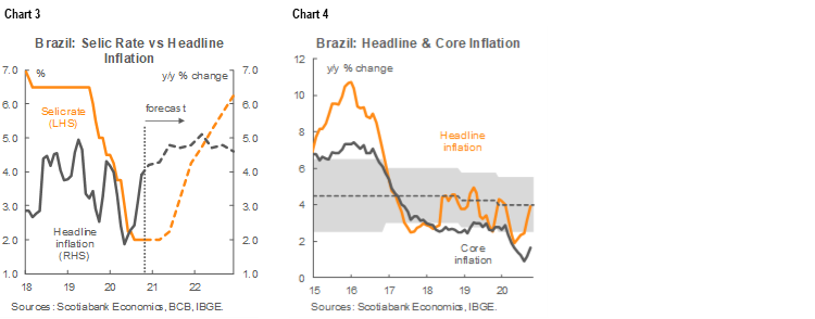 - Brazil. The BCB’s Copom is next scheduled to meet on Wednesday, December 9, where our Brazil economist expects the Selic rate to be held at 2.00% for a fourth meeting in a row (chart 3). In view of recent boost to our growth and inflation projections, we no longer see a strong chance of additional easing at this stage, but there is a material risk that hikes could be brought forward earlier than the first move we anticipate in Q2-2021 in an effort to shore up the BRL and respond to rising inflationary pressures (chart 4). While markets have been pricing a hold on December 9, they do anticipate a first hike in Q1-2021. Following its usual calendar, the minutes from the Copom’s meeting are due to be published on Tuesday, December 15.