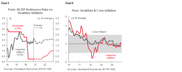 - Peru. The BCRP Board will make its last planned rate decision for 2020 on Thursday, December 10, where we expect the headline policy rate to be held again at 0.25% (chart 5). The meeting is likely to be uneventful, with the BCRP focused on efforts to mitigate volatility in the PEN and ensure major sectors of the economy continue to be able to access adequate liquidity. We forecast inflation, currently at 2.1% y/y (chart 6), to end-2020 at 2.0% y/y.