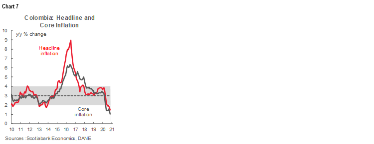 November inflation decelerated further from October in data published late on Saturday, December 5, by DANE. In sequential monthly terms, deflation deepened from -0.06% m/m in October to -0.15% m/m in November, well below expectations (i.e., 0.06% m/m in the Bloomberg survey and 0.08% m/m in the BanRep survey) and our projection of 0.08% m/m. November’s soft print pulled annual inflation down by -26 bps from 1.75% y/y in October to 1.49% y/y, well below the Bloomberg survey’s 1.71% y/y consensus expectation; similarly, core inflation came down from 1.42% y/y in October to 1.01% y/y in November (chart 7).