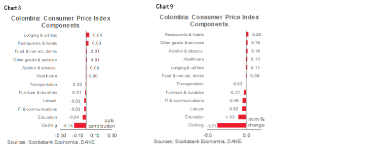 - Tuition fees at universities and technical education institutes fell again by -1.03% m/m, which meant education pulled headline inflation down by -0.04 ppts (chart 8, again). This was a residual effect of an atypical month where these institutions implemented price reductions to reduce desertion. DANE indicated that the negative effect of education prices on headline inflation would continue into December.