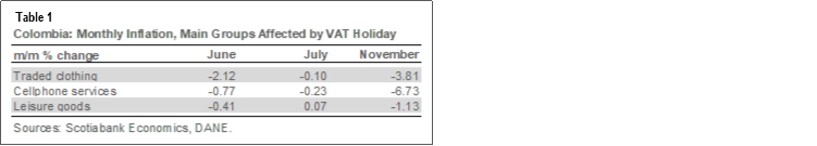 COLOMBIA: NOVEMBER PRICES UNDERSHOT EXPECTATIONS AS THE VAT HOLIDAY DROVE INFLATION DOWN TO A NEW RECORD AT 1.49% Y/Y