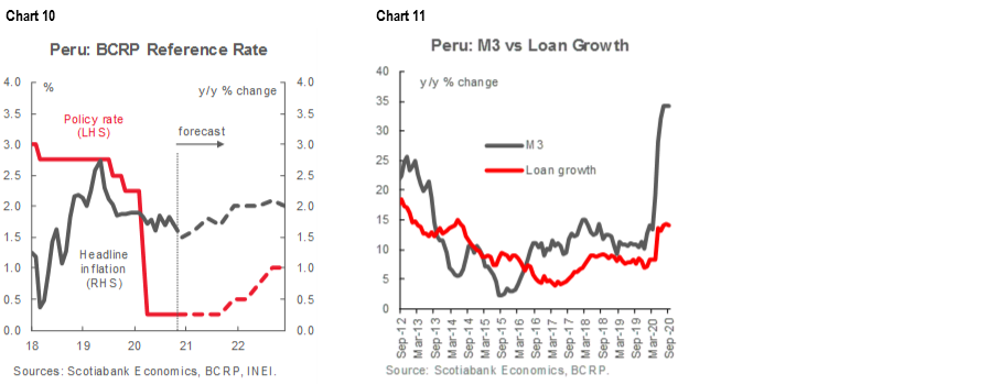 In its scheduled monetary-policy meeting on Thursday, November 12, the BCRP’s Board decided to keep its benchmark policy rate on hold at 0.25% (chart 10), as expected by the market consensus. In its statement, the BCRP maintained the tenor of its communications following its October 7 meeting, with its focus on the provision of liquidity. However, recent increases have so far been marginal and the BCRP made no mention of additional new measures to boost liquidity further. Total injections reached PEN 61.7 bn (8.1% GDP) as of November 11, a level similar to the PEN 60.5 bn recorded a month ago. Within November’s total, state-guaranteed lending operations amounted PEN 50.2 bn, up from the PEN 47.8 bn level reported a month ago. During the last two months, the pace by which Reactiva funds have been allocated has slowed down significantly. Nevertheless, credit to the private sector still grew by 14.1% y/y in September (chart 11).