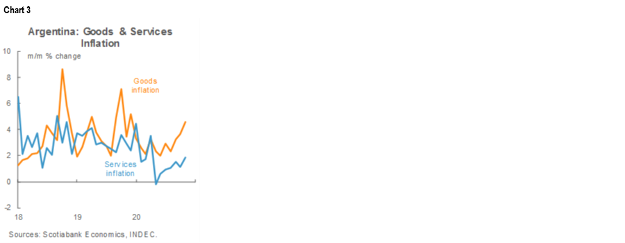 October inflation, according to data released by INDEC on Thursday, November 12, accelerated from 2.8% m/m in September to 3.8% m/m in October (chart 1). This was well above our 3.0% m/m forecast from two weeks ago; it also exceeded the market consensus, which drifted up from 2.8% m/m at end-October to 3.1% m/m by the time of yesterday’s print. October’s numbers took headline inflation up from 36.6% y/y in September to 37.2% y/y, the first rise in annual inflation so far in 2020 (chart 2). We have long forecast that annual inflation would begin rising in Q1-2021 on the back of monthly inflation at 3% m/m or faster; October’s print simply brings this projection forward by a few months.