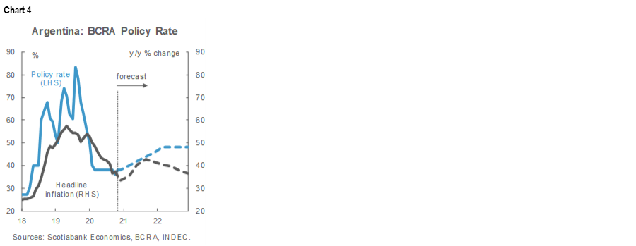 At least partially driven by October’s pick-up in inflation, on Thursday, November 12, the BCRA reversed recent cuts in its benchmark Leliq rate and raised it by 200 bps from 36.0% to 38.0% (chart 4). While the increase begins what we forecast will be a steady effort to take the real policy rate back into positive territory, it won’t be sufficient to stabilize the ARS: we continue to project more hikes ahead. Nevertheless, the BCRA’s rate increase was helpful in tandem with the Ministry of Economy’s commitment not to request any further transfers from the BCRA this year to finance its deficits.