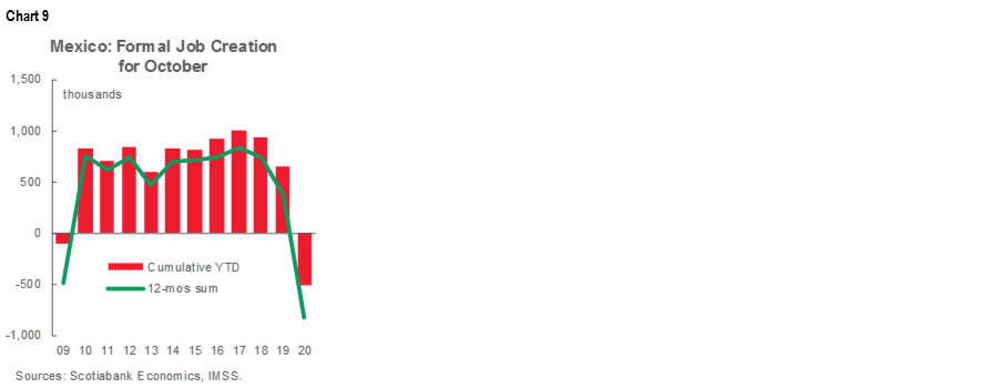 In data released on Thursday, November 12, by the Mexican Institute for Social Security (IMSS), formal job creation rose in October for the third straight month. The month saw a gain of 200,641 new jobs, the largest increase for any October since current records began in 1998. That said, October’s gains mark only another partial step in recovering losses from earlier in the year. The first ten months of 2020 saw the elimination of -518,609 positions while an even greater -824,591 jobs were lost over the last twelve months—the biggest losses on record (chart 9). As a result, job creation remained down -4.0% y/y in October, the seventh straight month in which employment gains were below those of the same month a year ago. This marks the longest run of annual declines since 2008–09. On the bright side, the number of employers affiliated to the social-security system (1,003 million) increased by 1,208 employers in October, but this still left the total down -0.1% y/y compared with October 2019.