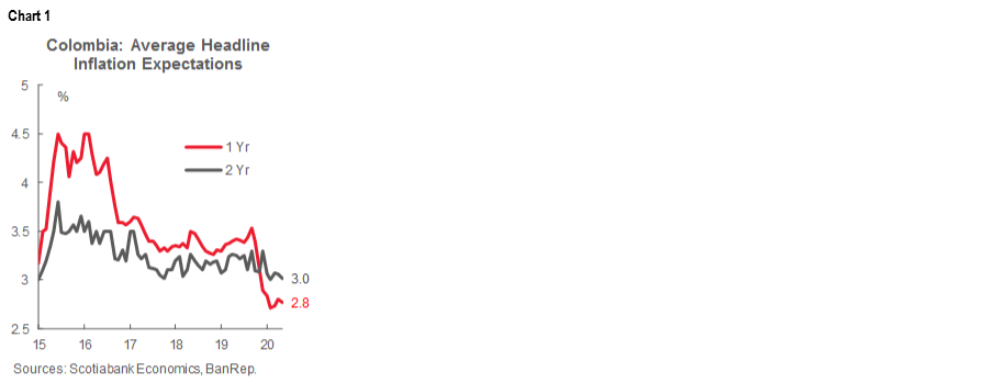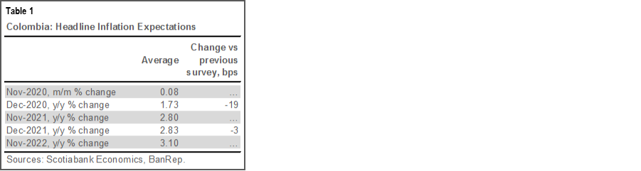 According to BanRep’s November survey of macroeconomic expectations, released on Tuesday, November 17, analysts see inflation hitting 1.73% y/y in December 2020, -19 bps lower than in last month’s survey (table 1). Consensus inflation expectations for longer tenors did not change much: at the 1Y tenor they stood at 2.80% y/y, the same as last month, and for the 2Y tenor they were 3.10% y/y (chart 1). For December 2021, inflation is expected to be below 3.00% y/y as weaker demand is projected to offset new price pressures from the withdrawal of government subsidies that kept some costs down, additional biosecurity costs, and FX pass-through effects. Looking at the survey’s details: