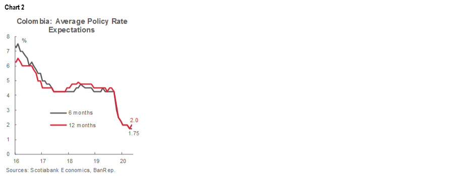 BanRep’s repo rate is expected to close 2020 at its current level of 1.75%, according to the median of survey respondents; market consensus is not expecting further rate cuts. The first hike of 25 bps is anticipated by September-2021, earlier than in the previous month’s survey. The monetary policy rate is expected to reach 2.00% by the end of 2021 (chart 2). For November’s meeting, analysts' consensus points to a hold.