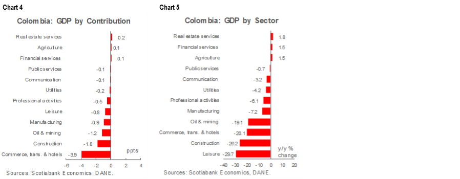 Growth in real GDP in Q3 matched the Bloomberg survey consensus of -9% y/y and was close to our expected rate of -9.3% y/y. Commerce, transport, and hotels (-20.1% y/y), construction (-26.2% y/y), and mining (-19.1% y/y) accounted for three quarters of the total year-on-year contraction. On the positive side, agriculture (1.5% y/y), financial activities (1.5% y/y), and real estate activities (1.8% y/y) dominated (charts 4 and 5). It is worth noting that Q1 and Q2 growth were revised down to 1.2% y/y and -15.8% y/y from their previous estimates of 1.4% y/y and -15.7% y/y, respectively, on the back of weaker agricultural and mining activities. For the nine months to end-September, the economy contracted by -8.1% y/y.