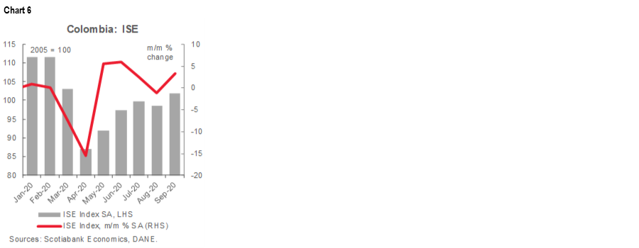 During the third quarter, the Colombian economy consolidated the re-opening process: during July and August, restrictions varied between regions, while in September, the re-opening was broadly-based and implemented nationwide. In fact, by July 78% of the economy had been allowed to re-open and by September around 95% of the economy was working again. The monthly GDP proxy, the ISE, showed that the national recovery gained steam in September with 3.4% m/m sa growth (chart 6).