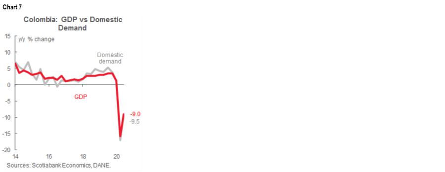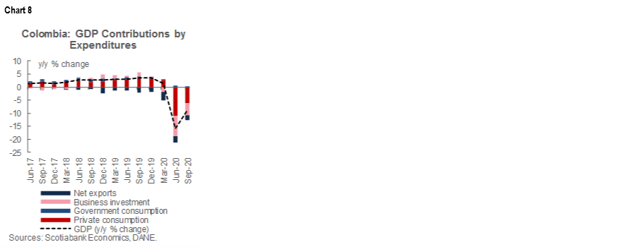 Net exports contributed negatively to Q3-2020 growth (chart 8) because imports expanded (13.5% q/q sa) by more than exports (1.9% q/q sa). Global demand for mining production weighed on exports, while recoveries in domestic consumption and investment activities drove import demand up. Having said this, we continue to project a current account deficit of -3.2% of GDP in 2020: adjustment is taking place in the income account, but not in the commercial balance.