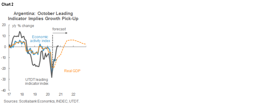 October’s UTDT leading indicator notched up a second month where it came in higher than a year ago, with annual growth in the index rising slightly from 1.59% y/y in September to 1.64% y/y in October (chart 2). The leading indicator’s recent prints align with our estimate that the September economic activity index is likely to show an improvement from being down -11.6% y/y in August to -6.0% y/y in September, on the back of a mild acceleration in seasonally-adjusted sequential month-on-month growth. This would pare annual GDP losses from -19.1% y/y in Q2 to -10.4% y/y in Q3, and keep Argentina on track for a -10.8% y/y contraction in 2020, as we forecast in the November 14 Latam Weekly. In a mix of sometimes conflicting data points and a still-serious surge in COVID-19, Argentina’s recovery continues to unfold in line with our expectations and close to market consensus.