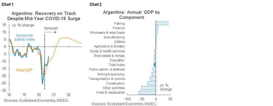 Argentina’s post-lockdown recovery—such as it is—remained on track in September as economic activity strengthened from being down -11.6% y/y in August to -6.9% y/y in September (chart 1). While this was much better than the consensus expectation of -8.6% y/y, it was close to the -6.0% y/y we forecast on the basis of other data points that have been received through the end of Q3. In sequential monthly terms, growth picked up from 1.1% m/m sa in August to 1.9% m/m sa in September. We had forecast a 1.5% m/m sa gain based on a different seasonal adjustment than INDEC appears to employ. Fishing led September’s gains, but this is a seasonal phenomenon (chart 2). More encouragingly, beyond fishing five of 15 other sectors showed annual gains, adding breadth to the post-lockdown rebound.